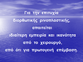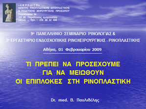 Κορυφαίοι Έλληνες και ξένοι ομιλητές / εκπαιδευτές παρουσίασαν τις νεότερες εξελίξεις στην ενδοσκοπική χειρουργική και πλαστική χειρουργική της μύτης. Ο Dr. med. Βασίλης Παυλιδέλης, Πρόεδρος της Ελληνικής Εταιρείας Πλαστικής Χειρουργικής Προσώπου πραγματοποίησε ομιλία με θέμα «Τεχνικές επανεγχείρισης στη ρινοπλαστική», στην οποία τόνισε ότι για την επιτυχία διορθωτικής ρινοπλαστικής, απαιτείται ιδιαίτερη εμπειρία και ικανότητα από το χειρουργό, από ότι για μια πρωτογενή επέμβαση. Όπως χαρακτηριστικά είπε, εδώ και εκατό χρόνια, τα χόνδρινα αυτομοσχεύματα από τον ίδιο τον ασθενή είναι τα πλέον κατάλληλα για κάθε είδους διορθωτική ρινοπλαστική. Με τη χρήση οποιουδήποτε άλλου ξένου μοσχεύματος, δρομολογείται ήδη η αποτυχία της επέμβασης.