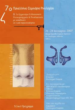 To 7ο Πανελλήνιο Σεμινάριο της Ελληνικής Ρινολογικής Εταιρείας πραγματοποιήθηκε στο Ίδρυμα Ιατροβιολογικών Ερευνών της Ακαδημίας Αθηνών, 26 – 28.01. 2007, σε συνεργασία με: