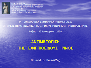 Ένα ξεχωριστό σεμινάριο, με μεγάλη συμμετοχή ιατρών ρινοχειρουργών, πραγματοποιήθηκε στο Ίδρυμα Ιατροβιολογικών Ερευνών της Ακαδημίας Αθηνών, από την Ελληνική Ρινολογική Εταιρεία, με Πρόεδρο τον Αν. Καθ. ΩΡΛ, κ. Ι. Γιωτάκη, στις 30.01 - 01.02.2009.