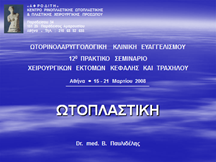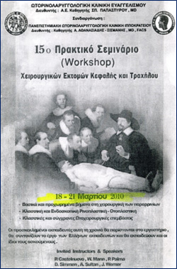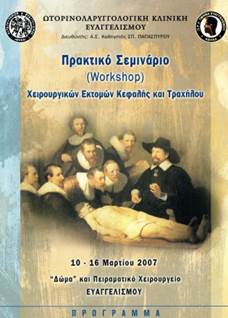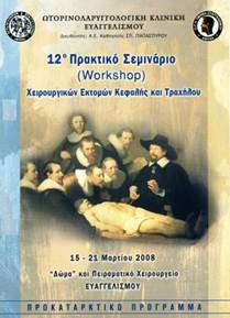Πραγματοποιήθηκε και φέτος το 12ο Πρακτικό Σεμινάριο (Workshop) Χειρουργικών Εκτομών Κεφαλής και Τραχήλου στο Νοσοκομείο “Eυαγγελισμός”, 15 – 21 Μαρτίου 2008, από τον Διευθυντή της ΩΡΛ Κλινικής, Καθ. Σ. Παπασπύρου.