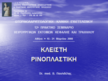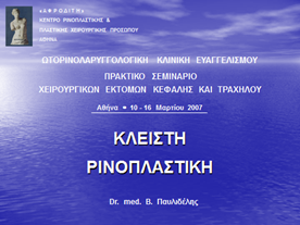 “Κλειστή Ρινοπλαστική”, ήταν το θέμα της ομιλίας του Dr. med. Βασίλη Παυλιδέλη στα πλαίσια του Πρακτικού Σεμιναρίου (Workshop) Χειρουργικών Εκτομών Κεφαλής και Τραχήλου, το οποίο πραγματοποιήθηκε, 10 – 16 Μαρτίου 2007,στο Νοσοκομείο “Eυαγγελισμός”, Αθήνα.