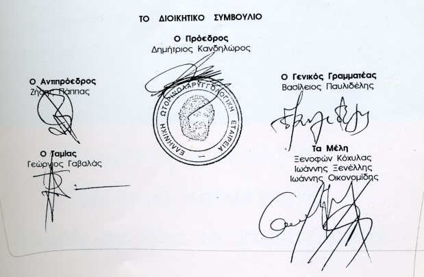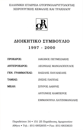 Το Διοικητικό Συμβούλιο της Ελληνικής Εταιρείας Ωτορινολαρυγγολογίας Χειρουργικής Κεφαλής και Τραχήλου(1997 - 2000). Από αριστερά: Bασίλης Παυλιδέλης, Αντώνιος Καμπέρος, Ιάκωβος Πετμεζάκης, Σπύρος Δάβρης, Λεωνίδας Μανωλόπουλος, Ζήσης Πάππας, Εμμανουήλ Χατζημανώλης. |
