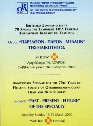 Πέρασαν 70 χρόνια από τότε, που κάποιοι συνάδελφοί μας Ωτορινολαρυγγολόγοι μαζεύτηκαν στην Αθήνα και ίδρυσαν την «Ελληνική Ωτολαρυγγολογική Εταιρεία». Σήμερα ονομάζεται Ελληνική Εταιρεία Ωτορινολαρυγγολογίας Χειρουργικής Κεφαλής και Τραχήλου. Τιμή και δόξα η σημερινή μέρα προς τους συναδέλφους μας αυτούς, πρωτοπόρους στη χώρα μας. Στη μνήμη τους αφιερώνεται η έκδοση και παρουσίαση αυτής, της πρώτης επετηρίδος των Ελλήνων Ωτορινολαρυγγολόγων. Αυτοί χάραξαν το δρόμο, πάνω στον οποίο πορεύτηκαν οι δικοί μας δάσκαλοι. Εργάστηκαν σκληρά σε όλα τα μέτωπα δραστηριότητας της ειδικότητάς μας και άφησαν να κληρονομήσουμε εμείς οι νεότεροι Ωτορινολαρυγγολόγοι, μια λαμπρή παρουσία στο χώρο των ιατρικών ειδικοτήτων, ένα αξιόλογο χώρο επιστήμης και προσφοράς, αλλά και εργασίας και επαγγέλματος. Βεβαίως, δεν υπάρχει καμία αμφιβολία ότι σ΄ αυτό το αποτέλεσμα έπαιξε σπουδαίο ρόλο η ραγδαία μεταπολεμική ανάπτυξη της ιατρικής τεχνολογίας και η μετάβαση σε Δυτική Ευρώπη και Αμερική, πολλών συναδέλφων, οι οποίοι εκεί μετεκπαιδεύτηκαν και έφερναν συνεχώς και στη χώρα μας όλα τα καινούργια επιτεύγματα της Ωτορινολαρυγγολογίας, όπως τυμπανοπλαστική, νευροωτολογία, ΩΡΛ αλλεργία, πλαστική χειρουργική προσώπου και τόσα άλλα. Το ξεφύλλισμα αυτής της επετηρίδος μας φέρνει μπροστά σε μια αποκαρδιωτική πραγματικότητα. Ο αριθμός των Ωτορινολαρυγγολόγων στην Ελλάδα είναι εξαιρετικά μεγάλος για τον πληθυσμό της χώρας. Ιδιαίτερα μεγάλος στα αστικά κέντρα. Αποκαρδιωτικό, αλλά από την άλλη και πρόκληση. Πρόκληση για να κατευθύνουμε και να στηρίξουμε τη νέα γενιά των συναδέλφων μας να αγωνιστούν, να μετεκπαιδευτούν και να επιτηδευτούν ακόμη και στις περιοχές, τις οποίες εμείς, λίγο έως πολύ, λογίζουμε ως «χαμένα εδάφη», όπως π.χ. η χειρουργική του θυρεοειδούς αδένα. Πρόκληση για να στηρίξουμε και να κατευθύνουμε τις νεώτερες γενιές των συναδέλφων μας, να είναι οπλισμένοι με υψηλή επιστημονική γνώση και κατάρτιση στην ειδικότητα, με αρετή και ήθος κατά την εξάσκηση του λειτουργήματος, αλλά και το βασικότερο να τους πλημμυρίζει αγάπη για τον ασθενή, για τον πάσχοντα άνθρωπο. Ως Πρόεδρος του απερχόμενου Διοικητικού Συμβουλίου, της Ελληνικής Εταιρείας Ωτορινολαρυγγολογίας Χειρουργικής Κεφαλής και Τραχήλου, επιθυμώ και από τη θέση αυτή να ευχαριστήσω ξανά όλα τα Μέλη του Διοικητικού Συμβουλίου για την άριστη, αρμονική και αποδοτική συνεργασία, την οποία είχαμε μεταξύ μας σε όλη τη διάρκεια /της θητείας μας, καθώς επίσης και για την αμέριστη συμπαράσταση και στήριξη, την οποία μου παρείχαν. Είναι βέβαιο ότι, χωρίς αυτά, δεν θα ήταν δυνατόν η θητεία μας να χαρακτηριστεί ως μία από τις πλέον δημιουργικές και πλούσιες σε επιστημονικές εκδηλώσεις, σε επιστημονική και άλλη στήριξη προς τους συναδέλφους και σε βελτίωση της οργάνωσης και λειτουργίας της Εταιρείας μας. Ακόμη, επιθυμώ να ευχαριστήσω τη διοίκηση του νοσοκομείου "Μητέρα", το οποίο μας παραχώρησε τους φιλόξενους χώρους του, καθώς και τις φαρμακευτικές και άλλες εταιρείες που μας συμπαραστάθηκαν οικονομικά, για την πραγματοποίηση της εκδήλωσης για τα 70 χρόνια πορείας της Εταιρείας μας στις 18-19 Μαρτίου 2000. Στον Αντιπρόεδρο του Διοικητικού Συμβουλίου της Εταιρείας, συνάδελφο Επίκουρο Καθηγητή κ. Λεωνίδα Μανωλόπουλο, ο οποίος είναι ο επερχόμενος Πρόεδρος του νέου Διοικητικού Συμβουλίου, το οποίο θα 