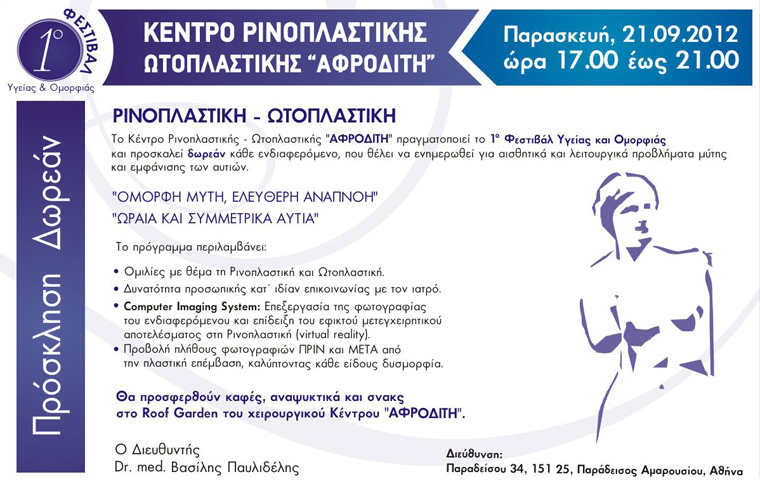 Το Κέντρο Ρινοπλαστικής - Ωτοπλαστικής "ΑΦΡΟΔΙΤΗ" πραγματοποιεί το 1ο Φεστιβάλ Υγείας και Ομορφιάς και προσκαλεί δωρεάν κάθε ενδιαφερόμενο, που θέλει να ενημερωθεί για αισθητικά και λειτουργικά προβλήματα μύτης και εμφάνισης των αυτιών.